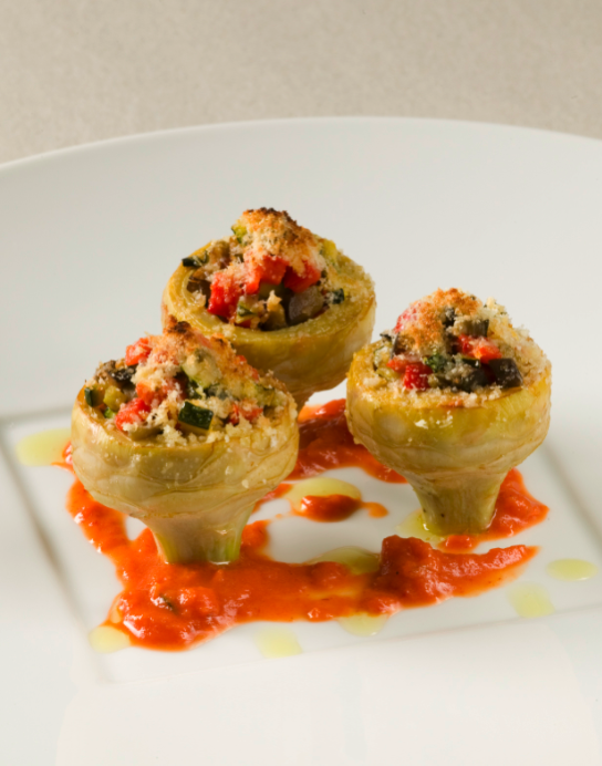 Petits artichauts farcis d’une fine ratatouille au parmesan, marmelade de tomates aux aromates
