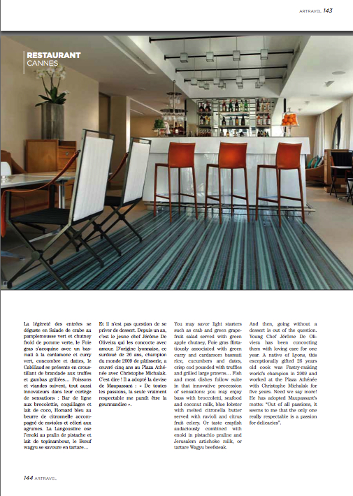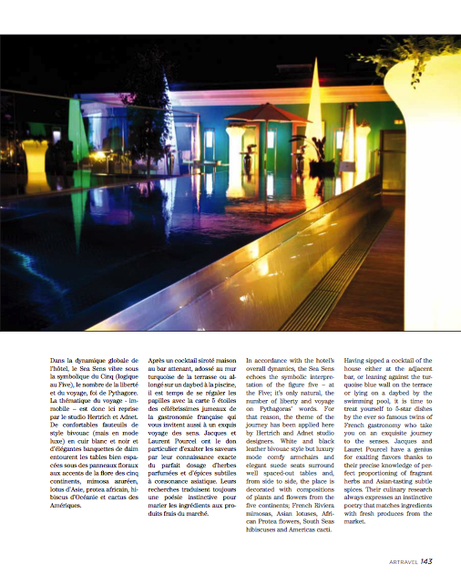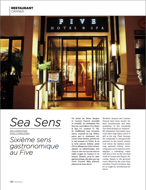 A quelques jours de l’ouverture officielle du Festival International du Film à Cannes, le magazine Artravel fait un focus sur la Méditerranée. les meilleurs lieux contemporains y sont présentés avec notamment 5 pages consacrées au Five Hôtel & Spas et la table signée par les frères Pourcel le Sea Sens.
