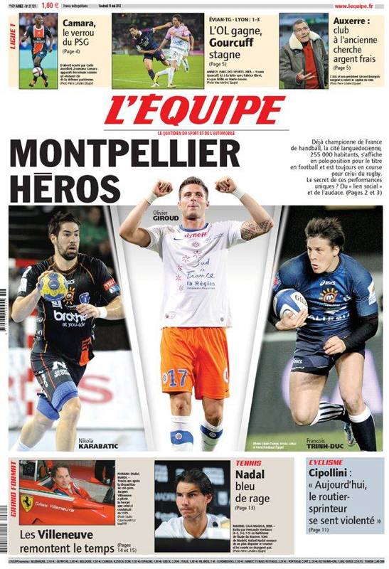 Le journal L’Équipe a fait sa première page ce vendredi sous le titre » Montpellier Héros « , où l’on retrouve les trois stars audacieuses du sport montpelliérain, Nikola Karabatic pour le handball, Olivier Giroud pour le football et François Trinh-Duc pour le rugby qui font briller le Languedoc au-delà des frontières.