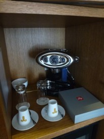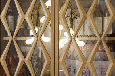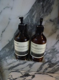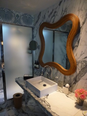 Luminaires et appliques murales art déco, distributeurs de savon, miroirs entourés de bois, placard de rangement qui abrite une machine à café expresso vintage, tout est là pour vous faciliter la vie et régaler.