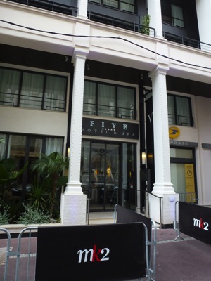 Le Five Hôtel & Spa, situé à quelques mètres du Palais des Festivals, fait son cinéma, devenu pendant toute la période des festivités l’arrière camp de la boîte de production MK2. Ce sont des dizaines de stars qui se rendent tous les jours dans les murs du boutique hôtel le plus chic de la ville. Conférences de presse, séances photos avec les plus grands photographes du monde, meeting, réunion d’affaires, le Five Hôtel est devenu en quelques jours l’endroit où se négocient les films des prochaines années.