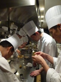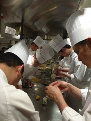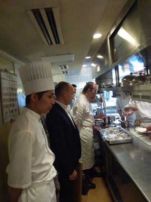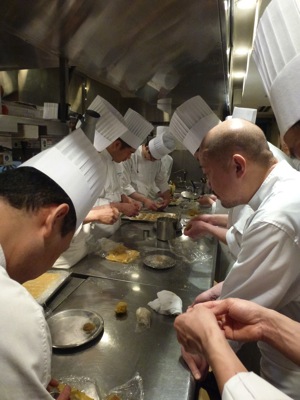 Un petit passage en cuisine où autour du chef Hiramatsu, 35 cuisiniers s’activaient pour la préparation du dîner qui réunissait également les meilleurs clients du restaurant Hiramatsu et de nombreuses personnalités.