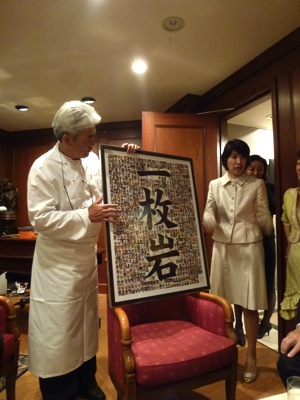 Les chefs Français offrirent à Monsieur Hiramatsu les cadeaux d’anniversaires pour fêter ces 30 ans de cuisine, un livre de cuisine ancien vieux de plus de 100 ans offert par Marc Haeberlin, une toile du peintre Roussillonnais Gilbert Lassale par les frères Pourcel.