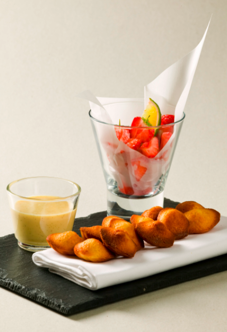 Servez la salade de fraises avec des quartiers de citron vert, accompagnée de madeleines chaudes et de la confiture de lait.