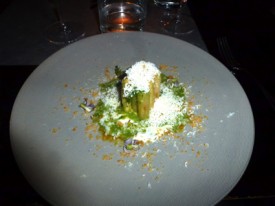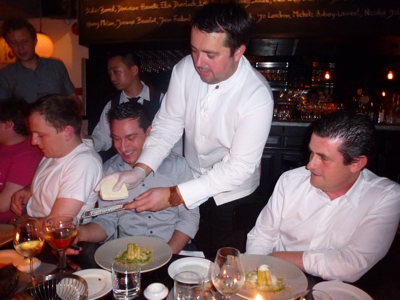 Le chef Jean-François Piège se chargea de râper le Pecorino à table, directement sur l’excellent plat d’asperges blanches.