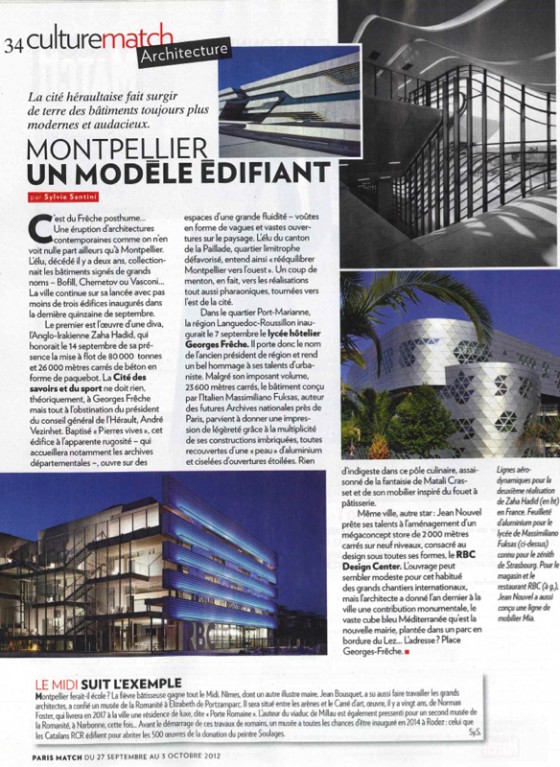 Jean Nouvel pour la nouvelle Mairie et le Design Center de RBC, la diva Zaha Hadid pour la Cité des Savoirs et du Sport » Pierre Vives « , le lycée hôtelier Georges Frêche signé Massimiliano Fuksas, ce sera bientôt au designer Philippe Starck et au bâtisseur Jacques Ferrier de s’exprimer en ville…