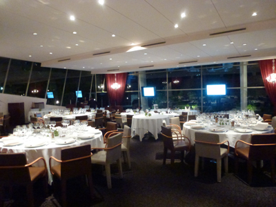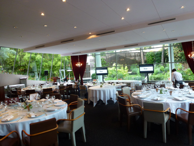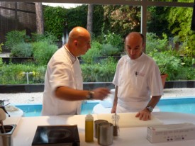 En tout début d’après-midi, une cuisine de circonstance fut installée dans la salle de restaurant du Jardin des Sens, le chef Laurent Pourcel et Thierry Rousset organisent le plan de travail pour disposer le matériel qui servira aux trois chefs de cuisiner en direct devant la centaine de personnes présentes. Tandis que l’équipe de salle s’active à dresser les tables et à nettoyer les couverts en argent qui équipent les tables.