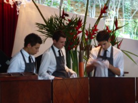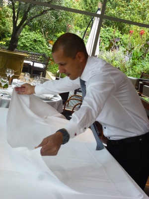 Barthélemy Bruni, Directeur de Salle du restaurant, quant à lui, assiste les chefs pour régler la mise de table qui servira de cuisine.