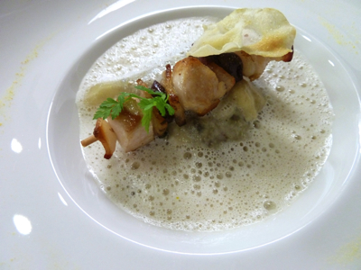 jus émulsionné de cèpes, petite brochette de filet de lapin.
