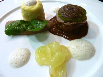 moelleux de pomme de terre au Comté, jus de veau acidulé.