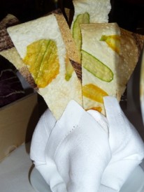 Primeurs de nos paysans à cru, condiment d’ici, fine pâte en impression de légumes