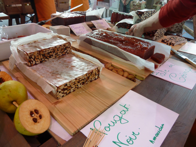 Nougat noir à la pâte de figue, pâte de coing, amandes de l’année, nous sommes en pleine saison du coing… c’est exceptionnel le goût de ces produits.