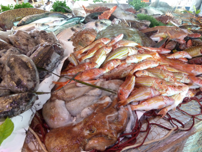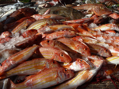 L’étal de poissons ne manqua pas d’étonner les chefs étrangers, le poisson de Méditerranée est typique, celui de la Rivièra unique. Rouget, grondin, baudroie, colinot, anchois, mulet, calamars, poulpes, daurade royale, ….