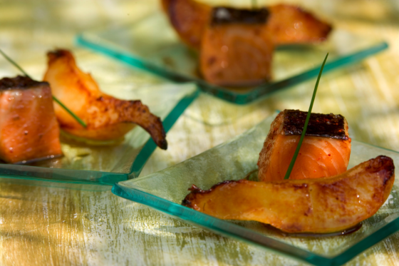 Le cube de saumon mi-cuit mariné au soja, poire rôtie
