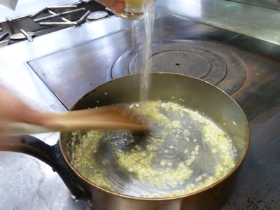 Dans une russe de taille adaptée, fondre sans cuisson les 15 g de beurre, ajouter les échalotes très finement émincées, saler légèrement pour permettre une meilleure suée de l’échalote sans coloration.