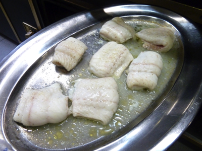 Beurrer et assaisonner de sel, poivre, le fond d’un plat allant au four. Plier des filets de sole en les repliant en deux, côté peau à l’intérieur (la partie côté arête, la plus jolie se trouvant sur l’extérieur), mouiller d’un peu de fumet de poisson (court mouillement), couvrir d’un papier beurré, monter en température sans ébullition, enfourner dans un four doux afin que la cuisson s’effectue par un simple pochage, afin de conserver le gélatineux du filet de sole.