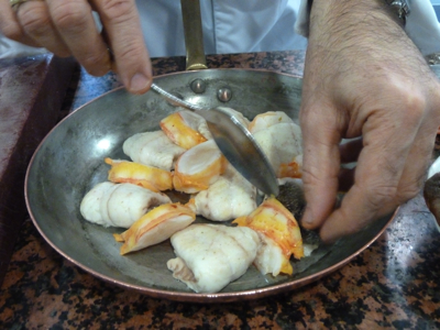 Trancher en médaillon la queue de langouste, la tempérer avec un peu de sauce prélevée.