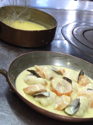 Réduire le restant de fumet quasiment à glace, ajouter la crème fraîche, réduire à consistance nappante, joindre la cuisson des filets de sole, réduire si besoin. Cette sauce doit être très blanche, brillante et nappante sur le dos d’une cuillère.