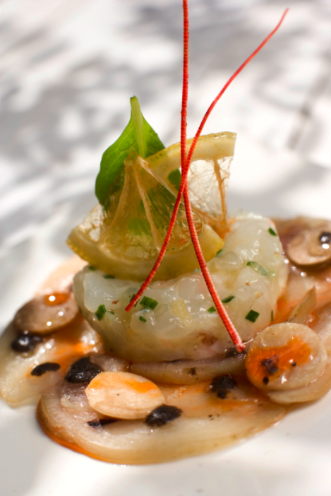 Le tartare tiède de langoustine au citron confit, émincé de pied de porc