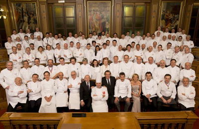 Reprenons là où nous nous sommes quittés hier sur le blog Pourcel… Un peu plus de 120 grands chefs étoilés étaient réunis pour la photo officielle avant le dîner donné en l’honneur de Paul Bocuse à l’occasion du Sirha 2013.