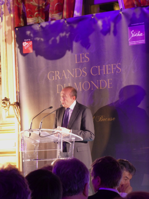 C’est ensuite au Sénateur Maire de Lyon Gérard Collomb de prendre la parole et de proclamer combien il est fier ce soir de recevoir tout ces grands chefs du monde pour célébrer Paul Bocuse dans sa ville. » Paul Bocuse est le plus grand chef du monde, une référence absolue, le mentor de beaucoup de chefs » déclara t’il. » Tout le monde connait Monsieur Paul le chef mais aussi l’ami, que tout le monde considère pour sa générosité et sa main tendue vers les autres – avant de rajouter – ce moment vous appartient «