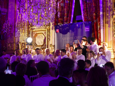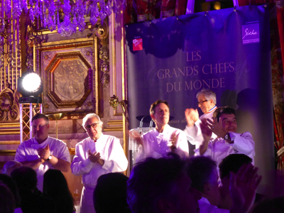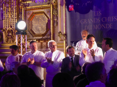 Au pied de l’estrade les chefs Michel Roth, Mathias Dalhgreen, Alain Ducasse, Thomas Keller, Emmanuel Renaut. Au dessus le chef Michel Guérard et au centre Georges Dos Santos.