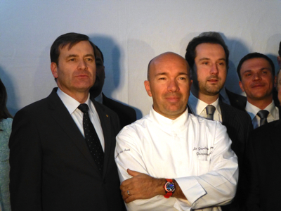 Avant de passer à table, préparation pour la photo officielle pour les concierges entourés de Bruno Franck, le chef Jacques Pourcel et Stéphanie Gibert responsable communication de Maison Blanche.