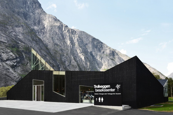 Situé au pied du plus haut rocher vertical d’Europe – Troll Wall Romsdal – Norvège – Murs et toits de verre fortement inclinés par le designer Norvégien Ramstad Reiulf, gradins et terrasse face au rocher.