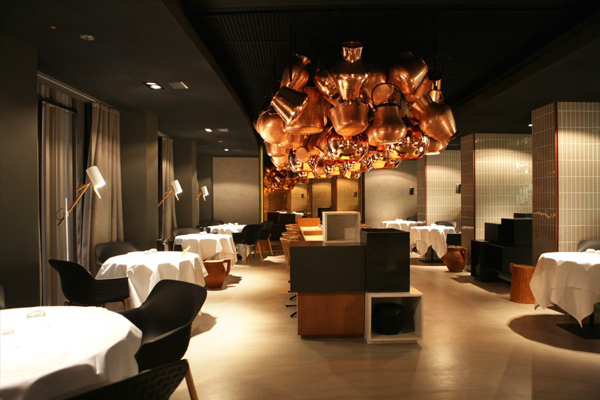 Premier restaurant hors d’Espagne pour le chef Paco Perez, situé dans le Das Stue HOtel à Berlin. Design par Patricia Urquiola, compression de cuivres