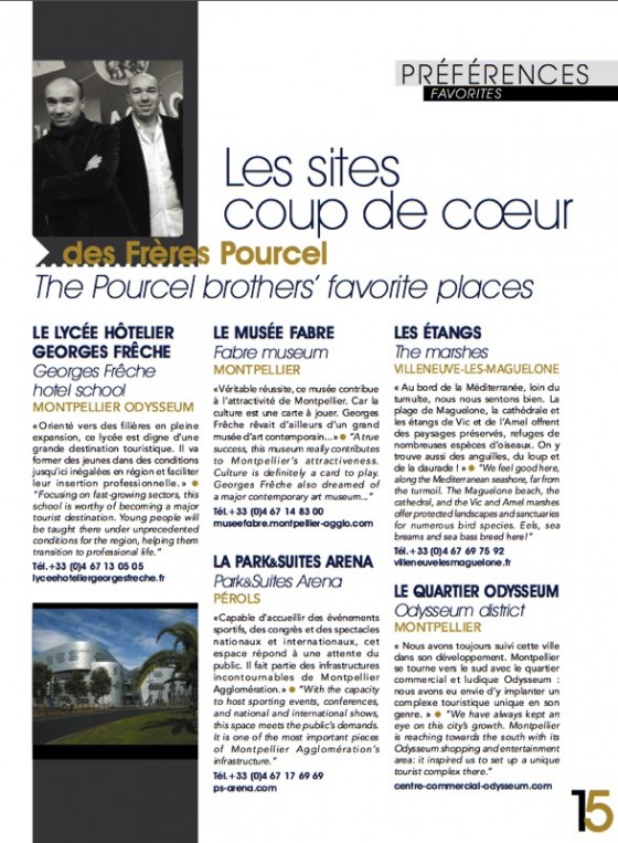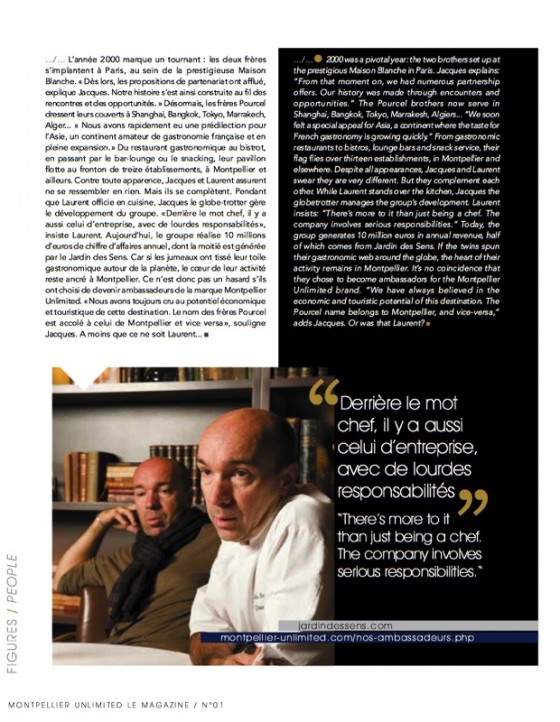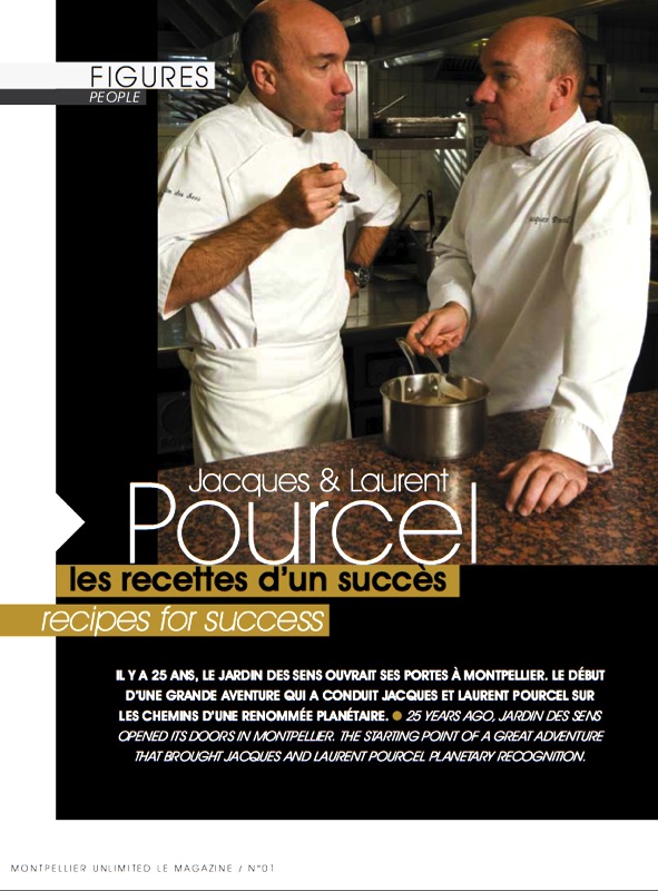 Le premier magazine » Montpellier Unlimited » vient de paraître, il est le reflet du dynamisme de Montpellier Agglomération, le lien d’ouverture vers d’autres horizons et le monde économique. Luxueux, informatif, moderne, édité en deux langues, c’est un magazine qui marque par sa différence. À l’intérieur, 4 pages sont consacrées aux frères Pourcel, leur histoire, leur succès, leur développement dans l’agglomération, leur vision d’avenir… Deux vrais Ambassadeurs de la marque Montpellier Unlimited.