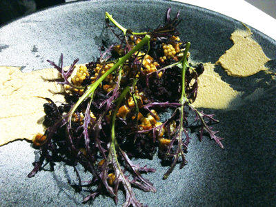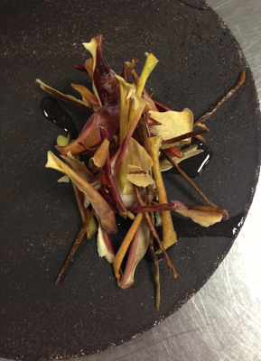 10h40 – Jose Ramirez-Ruiz – (Chez Jose, New York), accompagné de sa chef pâtissière, Pam. José a inventé son propre système de travail, il est itinérant ! Il a investi un restaurant pop-up. Il reçoit une poignée de gourmands avec une grosse poignée de plats (8 à 12) pour une poignée de dollars. Menu 100% végétal et locavore. Sur la scène d’Omnivore, José traite l’oignon comme une pièce de viande. L’oignon produit mineur est gratifié d’un traitement de produit star, la viande. José est le metteur en beauté de produits modestes ! Il travaille la betterave en tartare comme du bœuf, et rend hommage à Porto Rico sa patrie avec le haricot et le chou, naturellement. Les produits sont respectés et offrent leur vérité profonde, tout simplement ! Comme on ne jette rien, on ne gaspille pas, ici comme à New York, José Ramirez-Ruiz déshydrate les peaux d’oignons, en fait une poudre délicate, s’en sert comme le sel en légères pincées pour donner de la profondeur au plat. Mais il arrive à José de donner le premier rôle à la viande quand il fait rôtir des cochons de lait entiers, comme il le faisait à … La Chassagnette. On dirait le Sud !