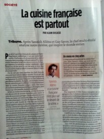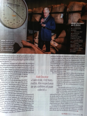 C’est ensuite le chef Alain Ducasse dans l’édition du 7 mars qui sous le titre » La cuisine française est partout » s’y exprime, il y analyse » Notre cuisine, qui inspire le monde entier « .