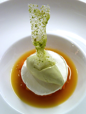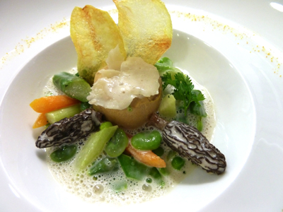 La fricassée de petits légumes de printemps aux morilles fraîches, royale de foie gras de canard, écume de champignons,