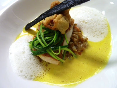 Le filet de turbot rôti sur un ragout de petits épeautres aux calamars et courgettes,