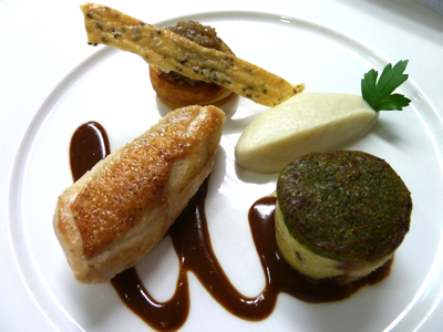 Le demi-coquelet : le filet rôti en cocotte, la cuisse en ballottine pochée en croute de pistache, galette de pomme de terre au Comté