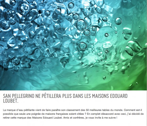 Repéré sur le net par notre équipe du blog Pourcel, le message sur le blog culinaire du chef E. Loubet en Le Petit Journal en Lubéron, ( suivez le LINK ) n’est pas passé inaperçu. Le chef étoilé appelle les chefs français à boycotter la marque San Pellegrino trouvant que le classement occulte le talent de nombreux chefs français.