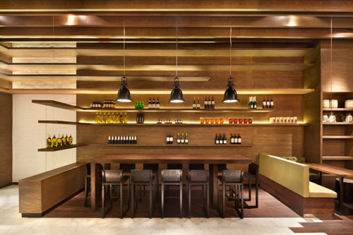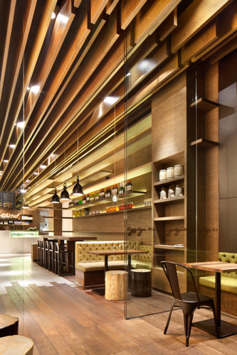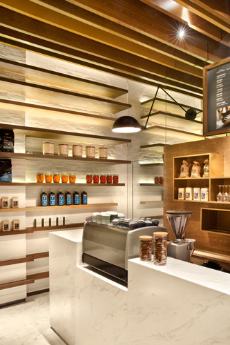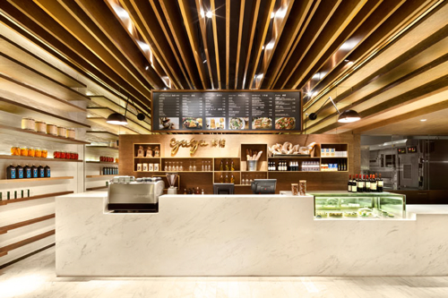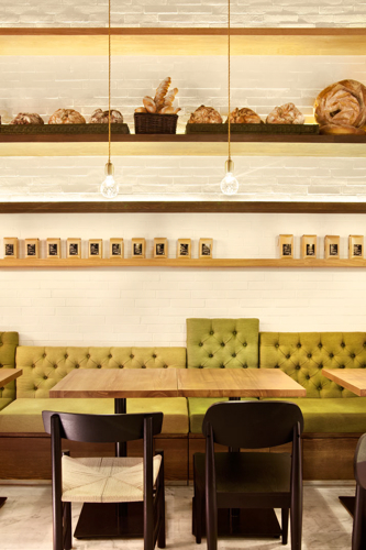 Le plafond est composé de lamelles de bois qui créent une lumière particulière qui crée une ambiance confortable et romantique grâce aussi aux éclairages variables. L’utilisation de beaux matériaux offrent un sentiment chic mais simple, sans pour autant sortir des codes traditionnels d’une boulangerie avec ses étagères et ses paniers.