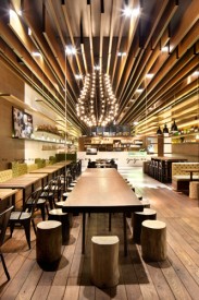 Gaga est fait pour se détendre, le confort appliqué proposé sur la grande terrasse à l’avant de l’établissement reproduit le design que l’on trouve à l’intérieur. À l’intérieur le grand et impressionnant comptoir en marbre contraste avec les boiseries naturelles.