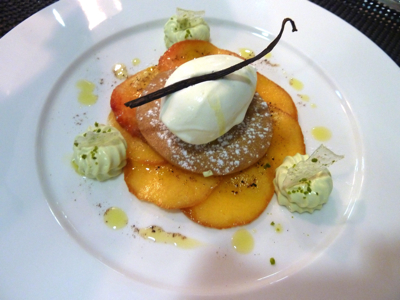 Le filet de canette des Dombes rôti et caramélisé aux dragées, roulé d’aubergine à la Languedocienne, fraîcheur de pêche, fine purée de céleri, jus de canard relevé d’orange.