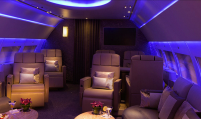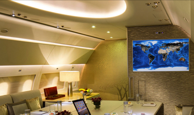 Cet ACJ319 peut transporter dix-neuf passagers. Sa cabine est divisée en deux zones principales : le salon et les suites. Le salon, situé à l’avant, peut être configuré pour organiser un dîner, une réunion ou se relaxer. Deux canapés sont installés en vis-à-vis et les petites tables situées entre eux se déploient en table de réunion si besoin. Le salon est également équipé de deux écrans LCD de 42 pouces.