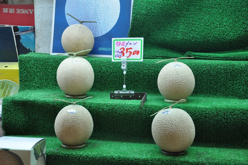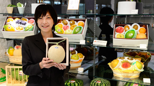 Les Japonais ne regardent pas à la dépense pour offrir des fruits, un cadeau très estimé. Ces petits cadeaux sont essentiels au lien social. Il faut que les produits soient exceptionnels, et surtout délicieux au goût. Cultivés dans des serres contrôlées par ordinateur, ces précieux melons cantaloup poussent dans la région de Shizuoka, au sud de Tokyo. La pollinisation se fait à la main, on ne laisse qu’un melon par plant pour qu’il puisse croître et embellir à l’aise. Pour des fruits extraordinaires, le prix s’oublie, la qualité reste.