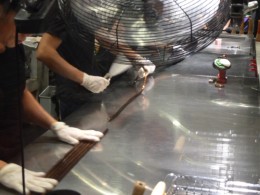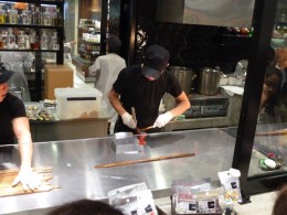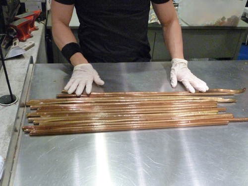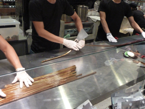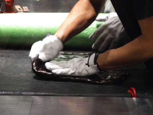 Les jeunes Japonais prennent en main des grosses masses de sucres qu’ils ont préalablement préparées à plusieurs parfums et couleurs et qu’ils ont roulées. Sous des lampes chaudes, ils en font des longs serpentins, on tire, on aplatit, on roule, écrase, on joue avec les couleurs….