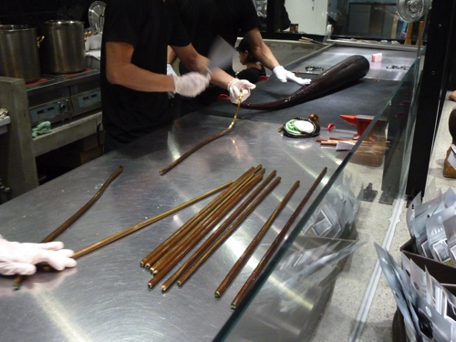 Tout cela attire un nombre incroyable de badauds et de clients, très curieux de voir se fabriquer des sucres d’orge.