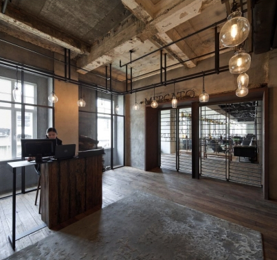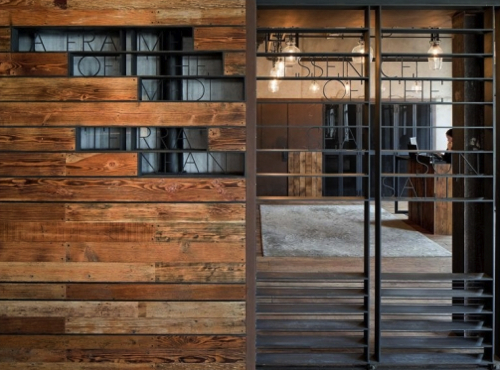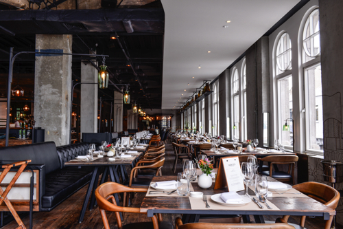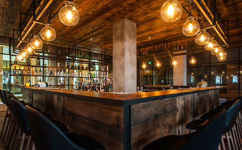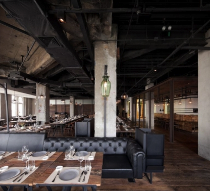 La décoration est brute, bétons cirés, plafond style industriel, plancher de bois foncé, banquettes de cuir, et chaises bridge en bois. Ce sont les luminaires qui créent en partie la décoration. L’esprit ressemble à un atelier, c’est chaleureux et bien imaginé.