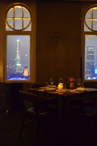 Le soir l’ambiance est plutôt relax, les lumières sont très tamisées laissant apparaître le Bund et ses immeubles design et très lumineux depuis les baies vitrées. Dès l’entrée vous pourrez apprécier l’alignement où se déclinent les bars puis toute une partie des cuisines ouvertes.