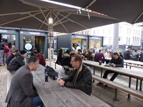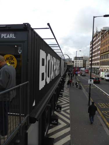 Autre concept version food truck. Longeant la gare de métro de Shoreditch vous trouverez toute une allée emménagée, qui n’est rien d’autre qu’une superposition de box/containers, une soixantaine où se sont crées dans chacun d’eux des commerces dont beaucoup de restaurants rapides et de bars branchés qui se mêlent aux minis boutiques branchées.