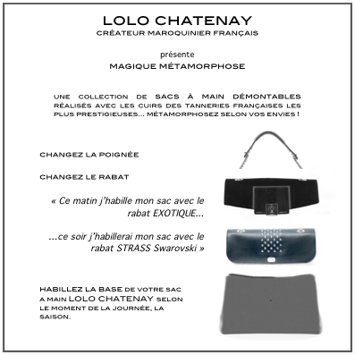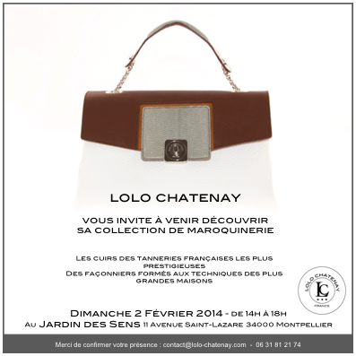 Venez découvrir les collections de sacs à main de la créatrice – Lolo Chatenay – au restaurant le Jardin des Sens ce dimanche 2 février. Une vente privée est organisée de 14 h à 18 h dans la salle du restaurant où vous seront dévoilés les derniers modèles de la créatrice pour sa collection Printemps/été 2014. Maroquinerie haut de gamme et cuir de grande qualité pour une ligne de sac à main totalement innovante.
