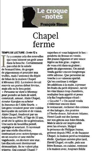 La célèbre colonne » Croque-note » du samedi sur le quotidien Le Figaro si souvent décriée par les chefs ( on ne comprenait d’ailleurs pas toujours tout ) a disparu pour laisser la place » Minutes Gourmandes » signée par Stephane-Durand Souffland.