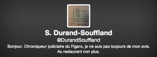 Stéphane Durand-Souffland est journaliste, chroniqueur judiciaire au Figaro. Il est le témoin privilégié des procès d’Assises. Il a été le président de l’Association de la presse judiciaire de 2008 à 2011. En ocotbre 2012, il publie Frissons d’Assises. L’instant où le procès bascule aux éditions Denoël. Grand connaisseur de la table, il semblerait que mis à part les tribunaux il se passionne aussi pour la gastronomie, d’ailleurs sur sa page d’accueil sur Twitter il s’annonce ainsi :