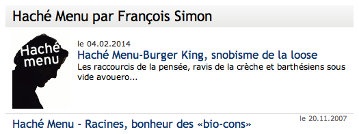 Ont disparu aussi ses papiers dans le Figaroscope ( supplément parisien du Figaro le Mercredi ) et sa rubrique » Haché-Menu « , c’est son compatriote de toujours Emmanuel Rubin qui reprend la suite et qui reprend visiblement le flambeau.